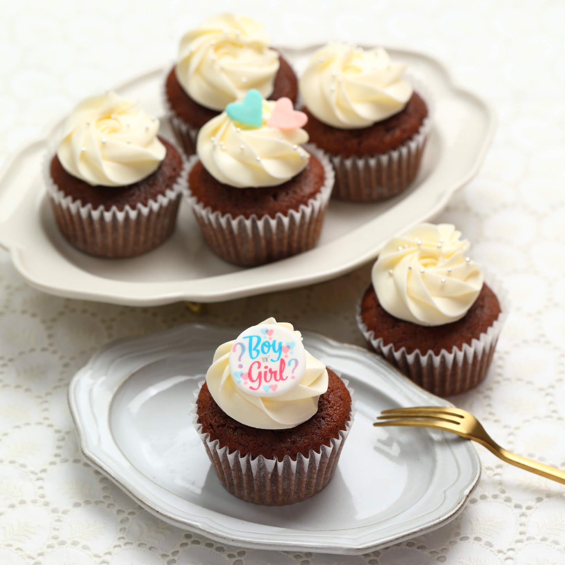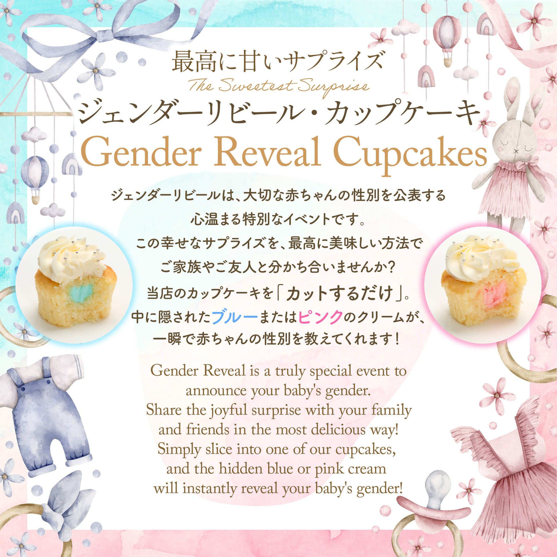 | 商品詳細 | 心ときめく瞬間を彩る、ジェンダー リビールカップケーキボックス! お選びいただいたフレーバー(バニラまたはチョコ)のカップケーキに、性別をサプライズ演出するクリームを込めて――。 カップケーキの中には、優しい色合いのライトブルー(Boy)またはピンク(Girl)のバタークリームが隠されています。大切な人と一緒にカップケーキをほおばると、ふんわりと広がる甘さの中から、ブルーやピンクのクリームが顔をのぞかせます。その小さな色のサプライズが、パートナー、ご家族、ご友人とのGender Reveal(ジェンダー リビール)を、より特別で温かな思い出にします! これから生まれてくる新しい命のための大切なひとときが素敵な時間となるよう、心を込めてお作りいたします。 |