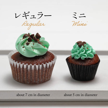 | 商品詳細 | しっとりとしたココア生地に、ミントの香りが爽やかに広がるミントクリームを絞ったミントチョコカップケーキ。粗く砕いたチョコレートチップをトッピングしているので、ザクザクとした食感もお楽しみいただけます。 お口の中でミントの清涼感とチョコレートの風味が溶け合い、一口食べると爽やかで幸せな気分になれるミントチョコカップケーキは、重たい甘さが苦手な方にもおすすめです。色合いもおしゃれで美しく、チョコミント好きの方に喜んでいただけるカップケーキです。 |