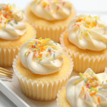 | 商品詳細 | しっとりしながらもふんわり軽いプレーンのスポンジに、優しい甘さのバニラクリームをたっぷり絞り、カラフルなチョコスプレーで彩ったシンプルなバニラカップケーキ。 イギリスの家庭の味を再現した、どこか懐かしくほっとする素朴なおいしさで、お子様から大人の方まで、幅広い方々に喜んでいただける定番のカップケーキです。 小さなお子さまでも食べやすいバニラカップケーキは、お子様もご一緒のパーティーやご自宅でのティータイムにもぴったりです。 |