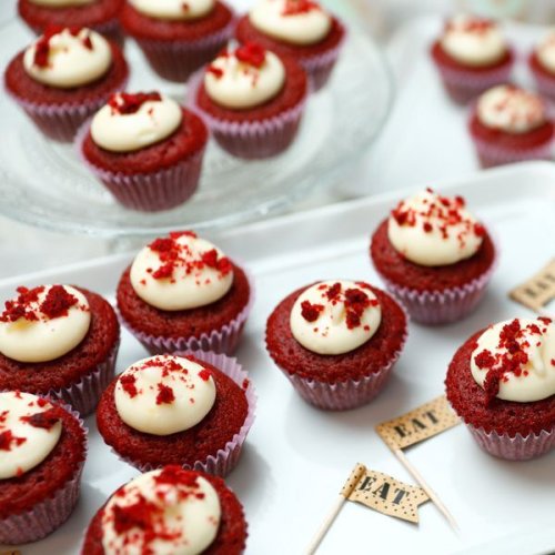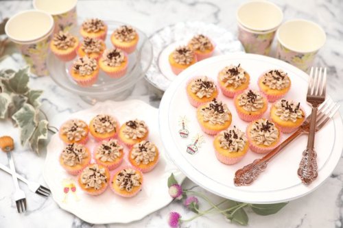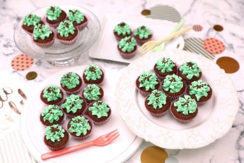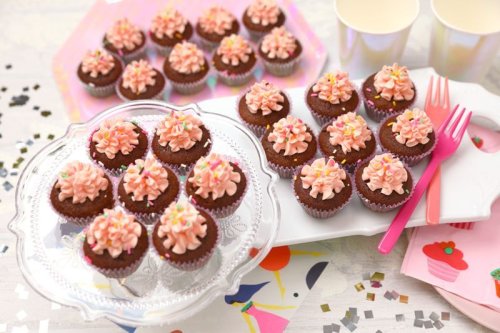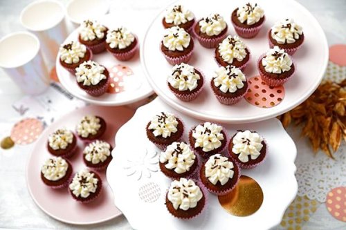 A selection of 3 mini cupcakes in 9 flavours (vanilla, pink vanilla, lemon, vanilla chocolate, chocolate vanilla, pink chocolate, mint chocolate, red velvet). 24 pieces.
