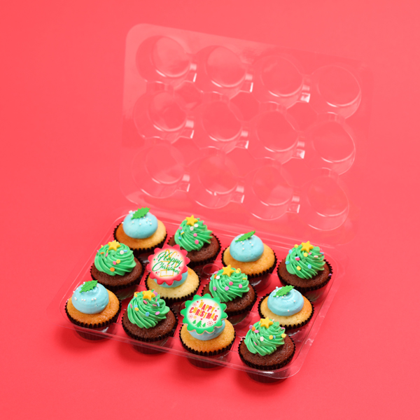 Mini cupcakes with a cute mini tree in a Christmas design. Tree: choco vanilla + holly: blue vanilla. 12 pieces.