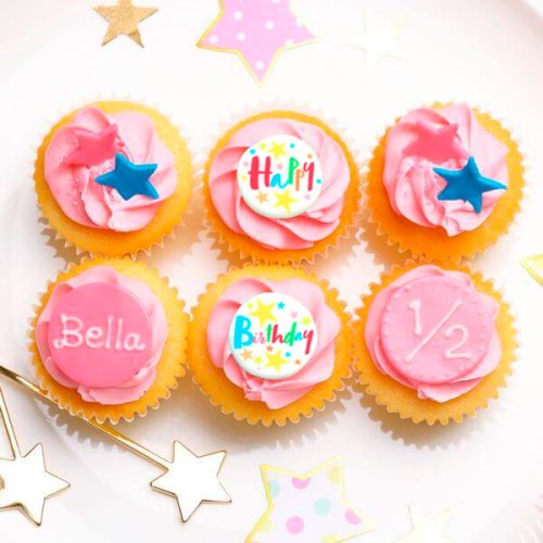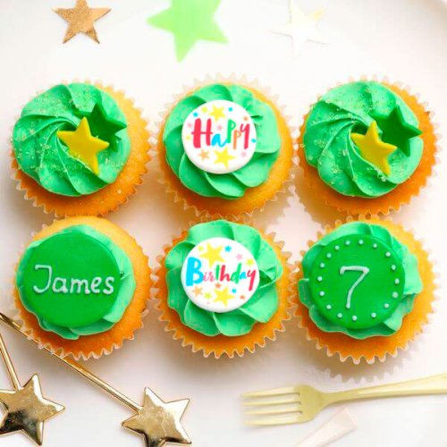 Happy Birthday box containing six sunflower-themed chocolate vanilla cupcakes and edible sugar decorations (optional name or short message).