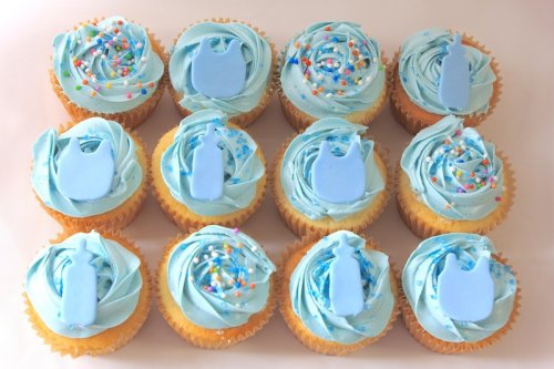 12 Pink Vanilla cupcakes with sugarcrafts (4 bottle, 4 bib)